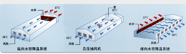濕簾降溫系統(tǒng):水流在水泵的作用下通過(guò)噴淋管道進(jìn)入波紋狀的纖維紙表面,從而形成水簾,當(dāng)室外干熱空氣在風(fēng)機(jī)的作用下穿過(guò)水簾時(shí),空氣中的熱量將被流動(dòng)的水流帶走蒸發(fā),從而達(dá)到降溫的目的。
